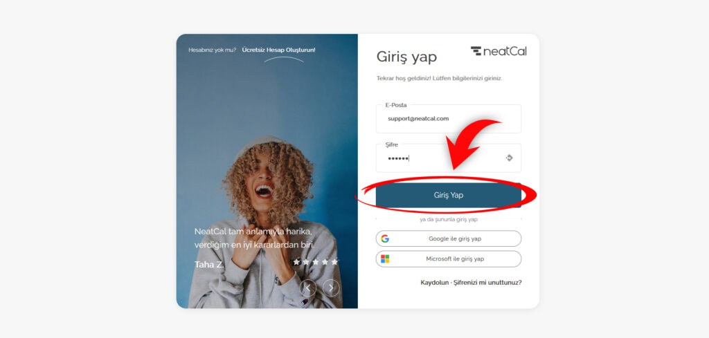 neatCal’e giriş yapmak için aşağıdaki adımları takip edin: